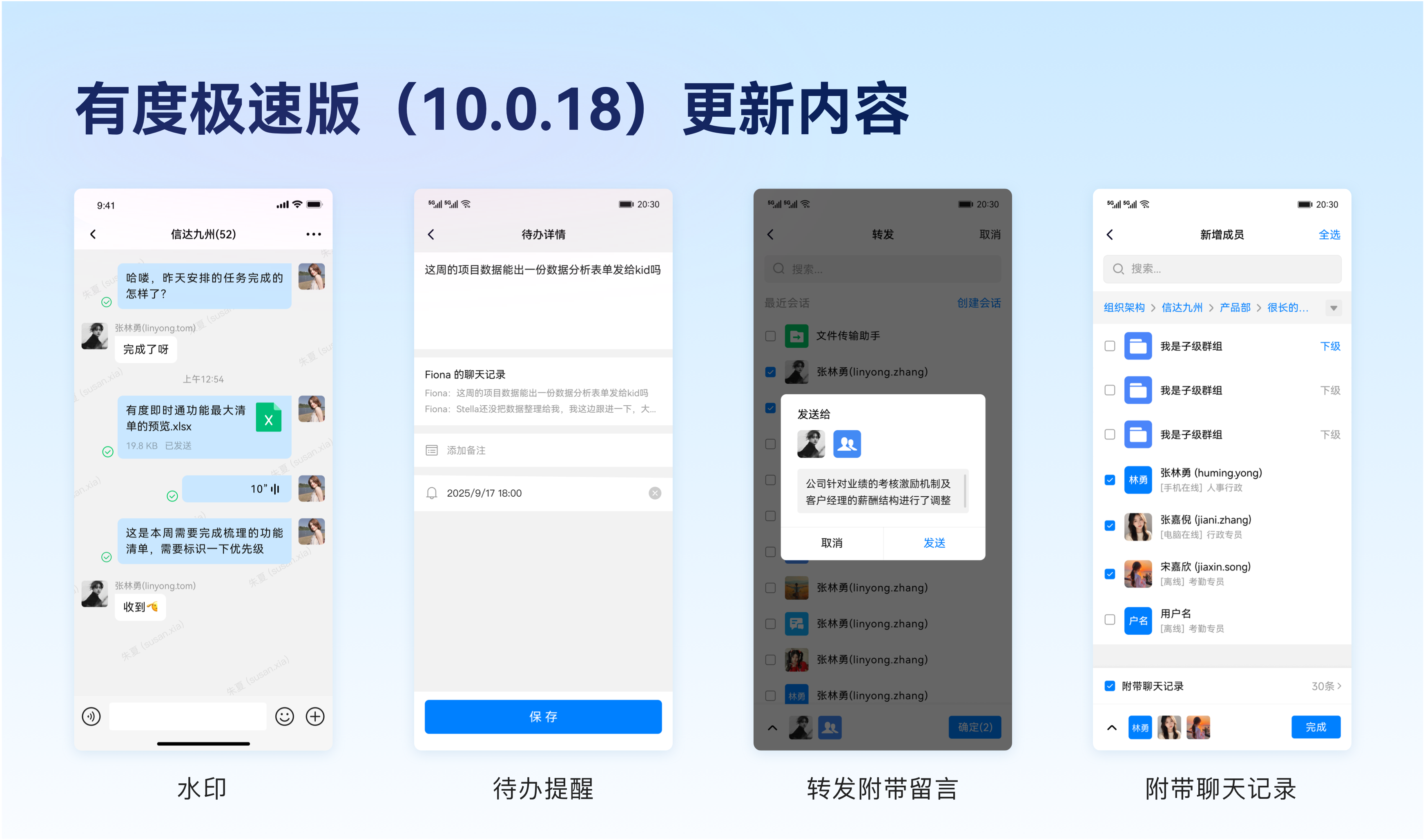 各位有度用户,大家好!有度新版本移动端极速版(10.0.18)、客户端(10.0.19) 以及服务端(10.0.18) 已经发布,本次更新重点优化了聊天记录搜索功能、待办上限扩大、移动端极速版体验等方面,以下是本次更新的主要内容。